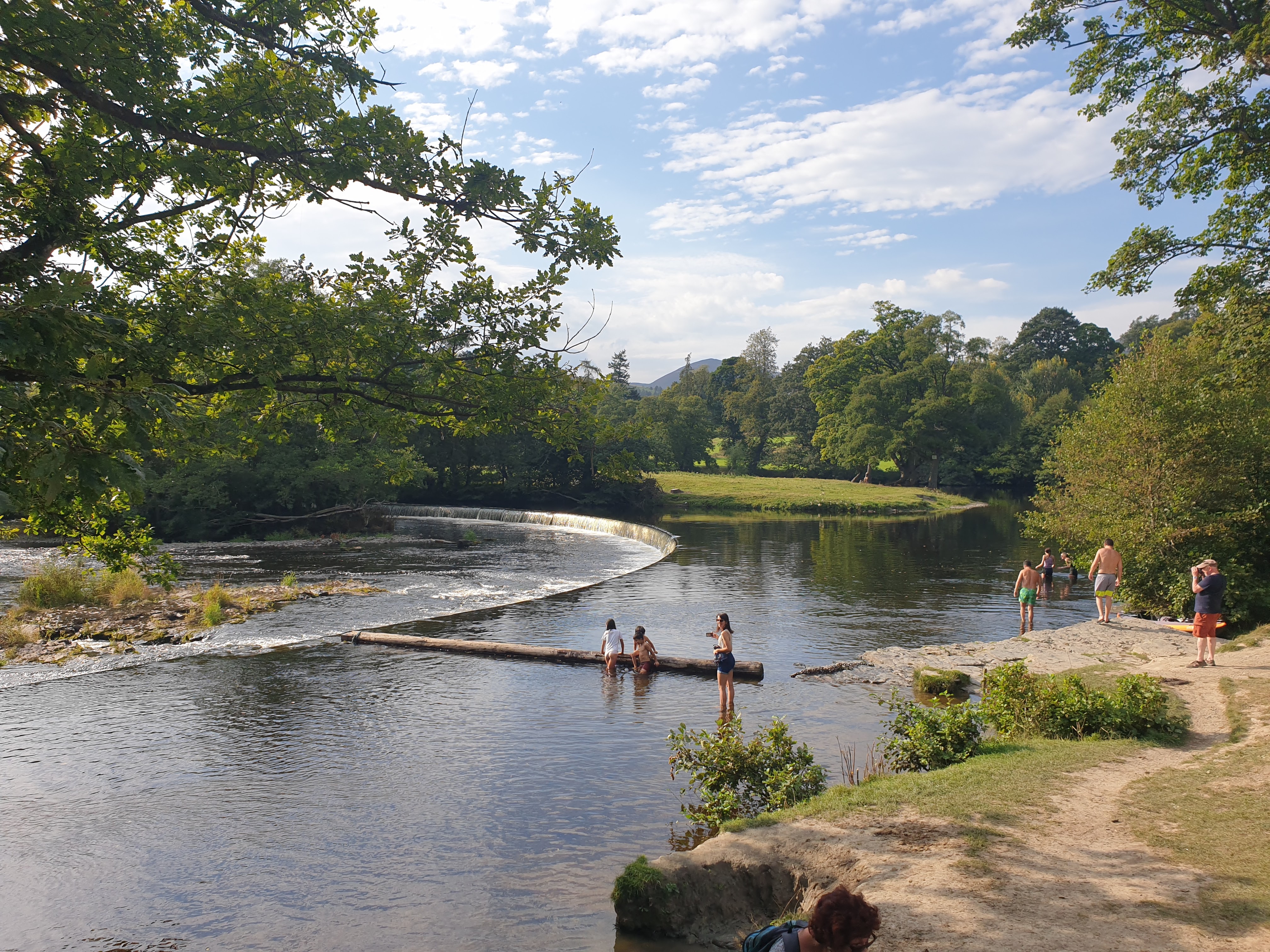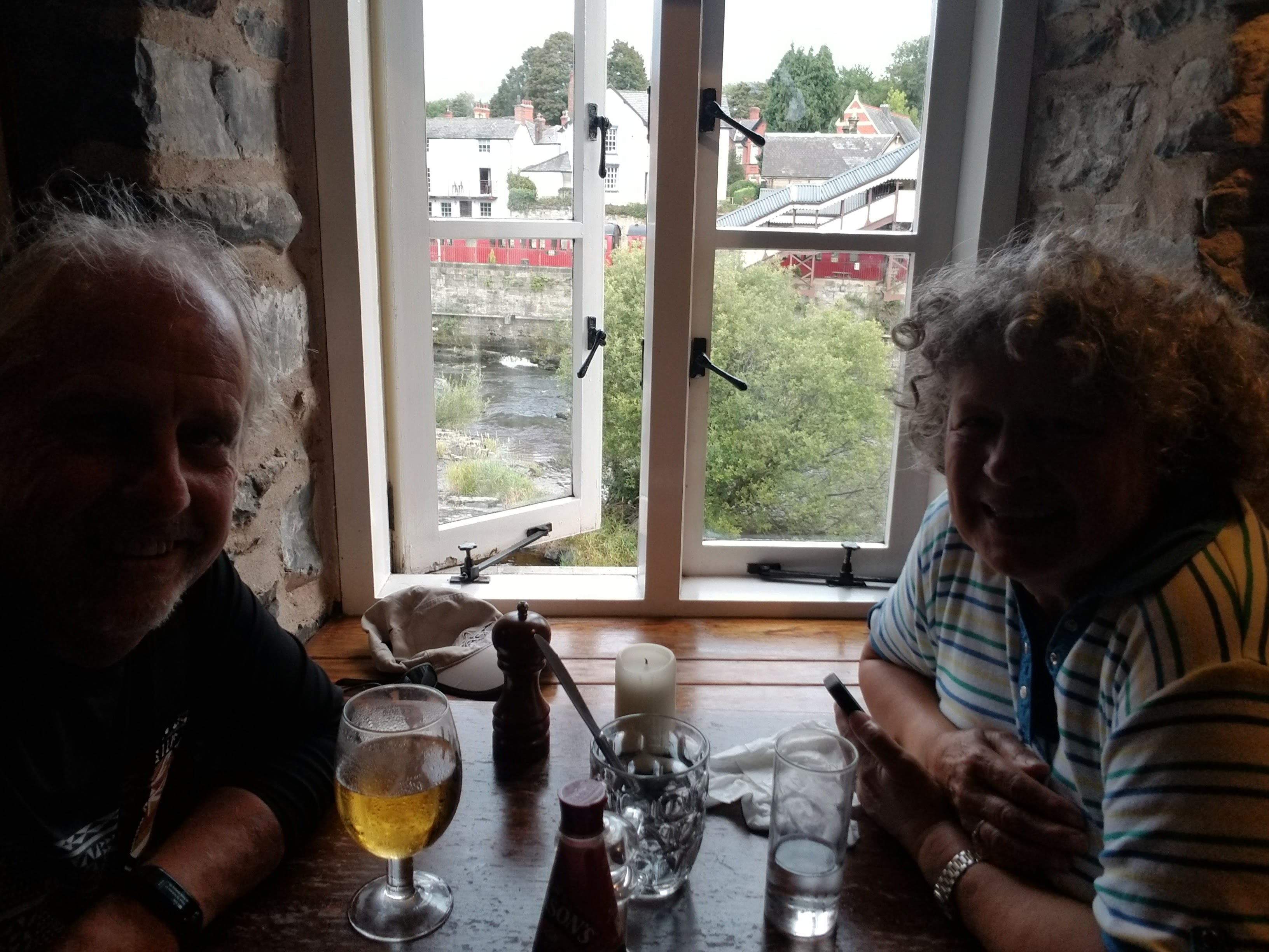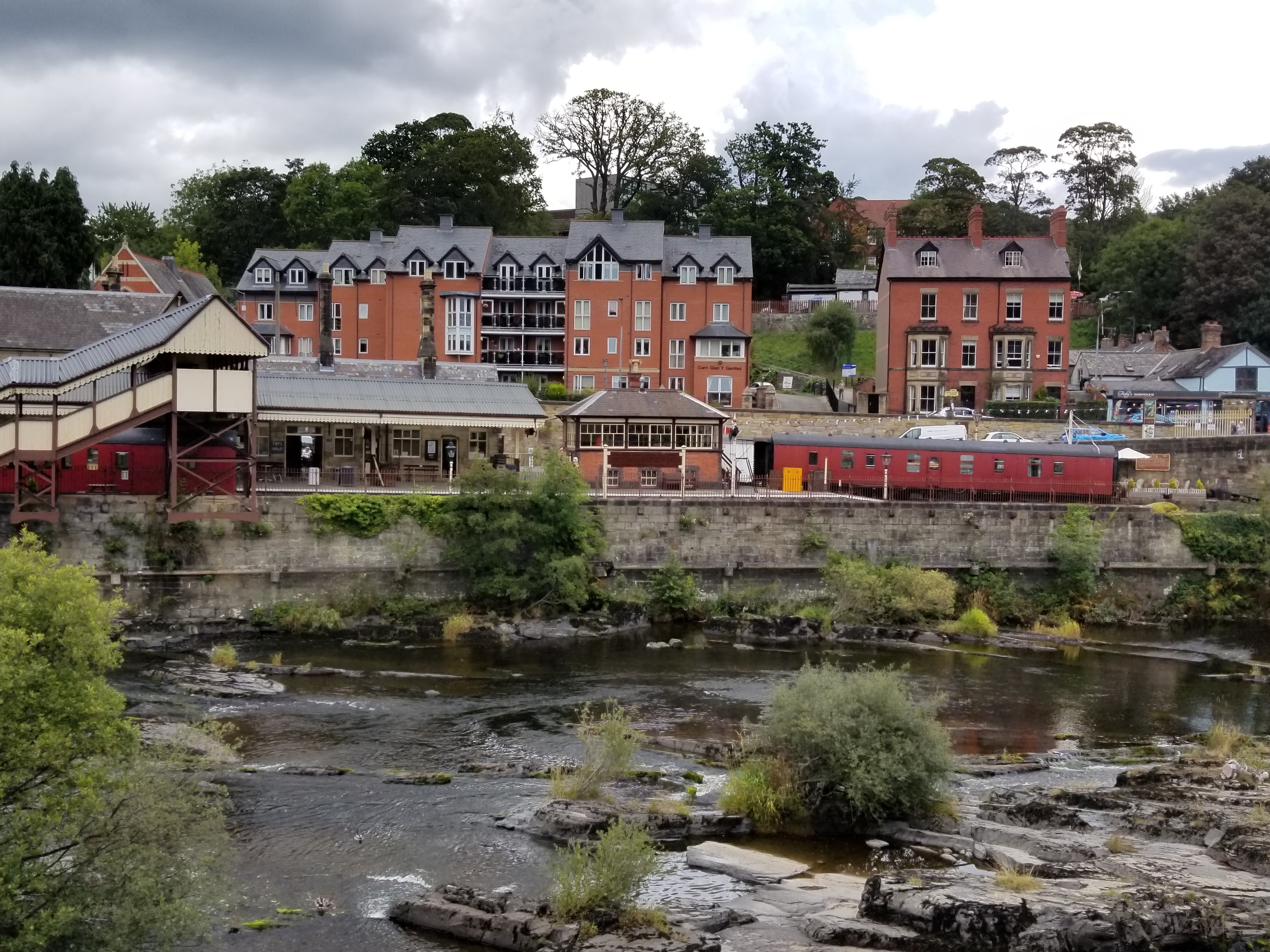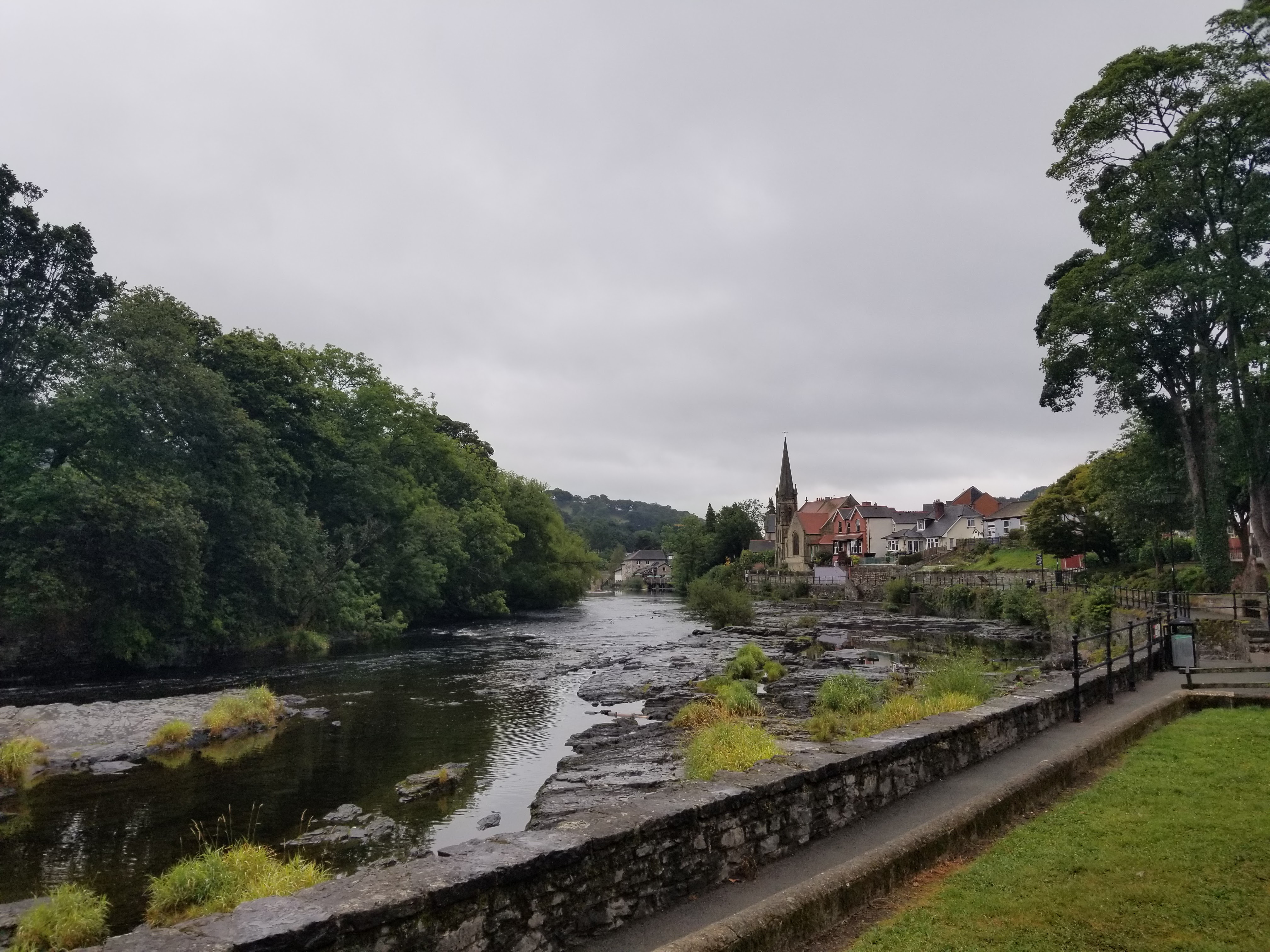 I made it back into the historic and picturesque town of Llangollen. It’s a beautiful area and the town itself is a wonderful mix of tourist shops and local (real) stores and services. The canal runs along up on the hillside, most things in Wales appear to be perched on hillsides or the tops of ‘mountains’ (as someone from British Columbia, I use the term a bit loosely). It actually continues further upstream to where the River Dee splits off, or rather, where to the canal splits off the river. There’s a pretty park there, with a large, semi-circular weir to moderate the flow, called Horseshoe Falls.